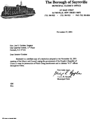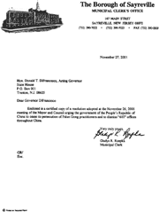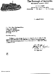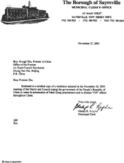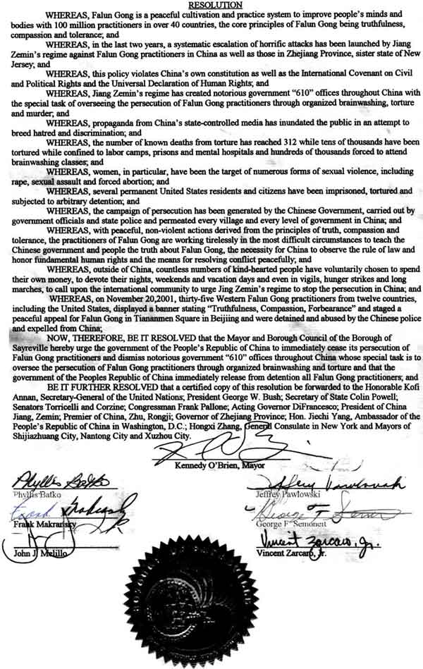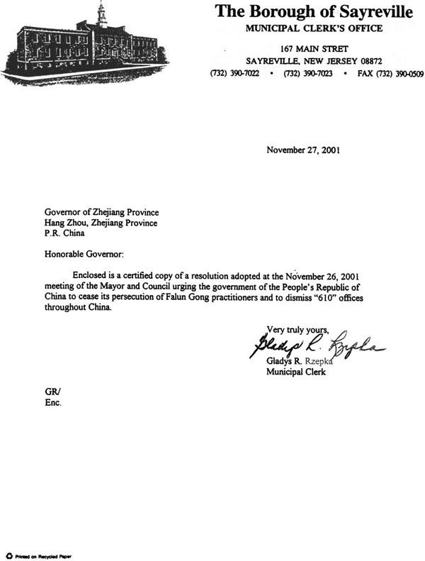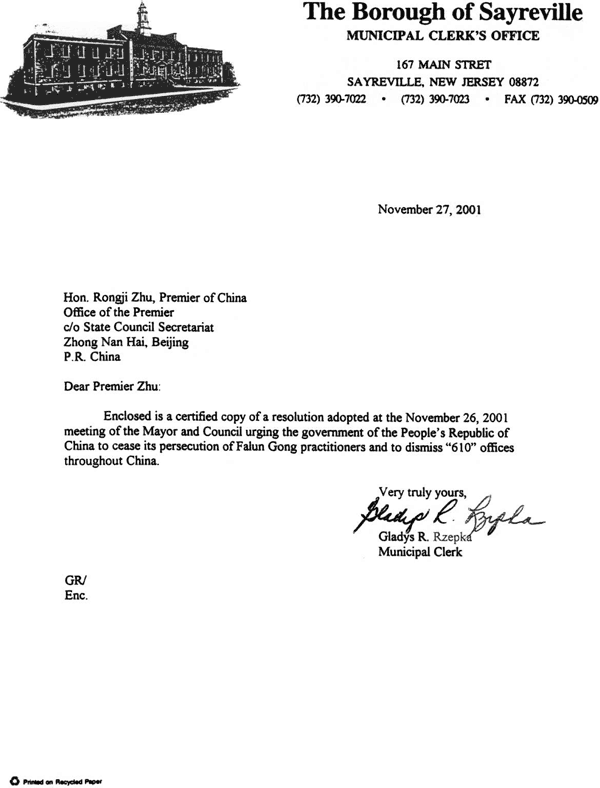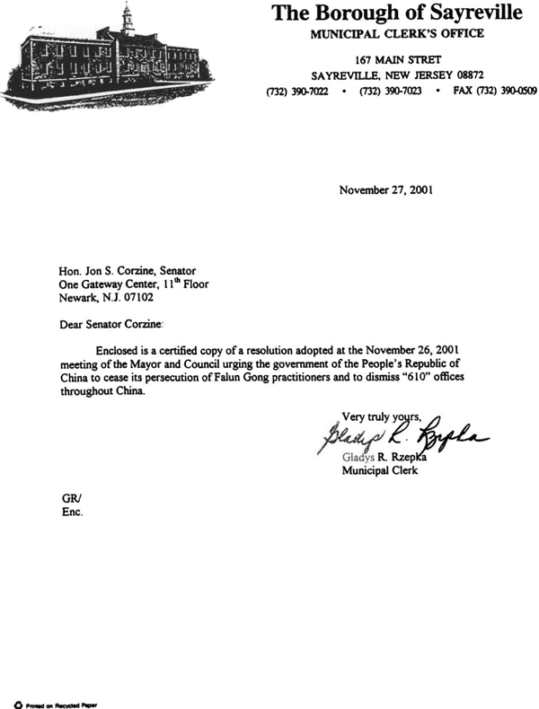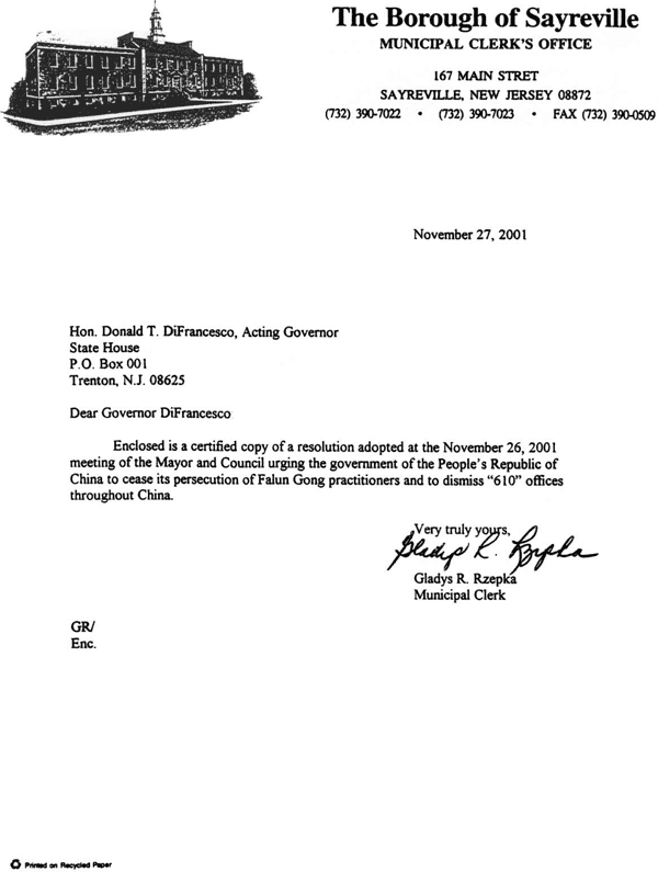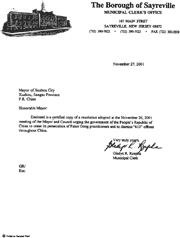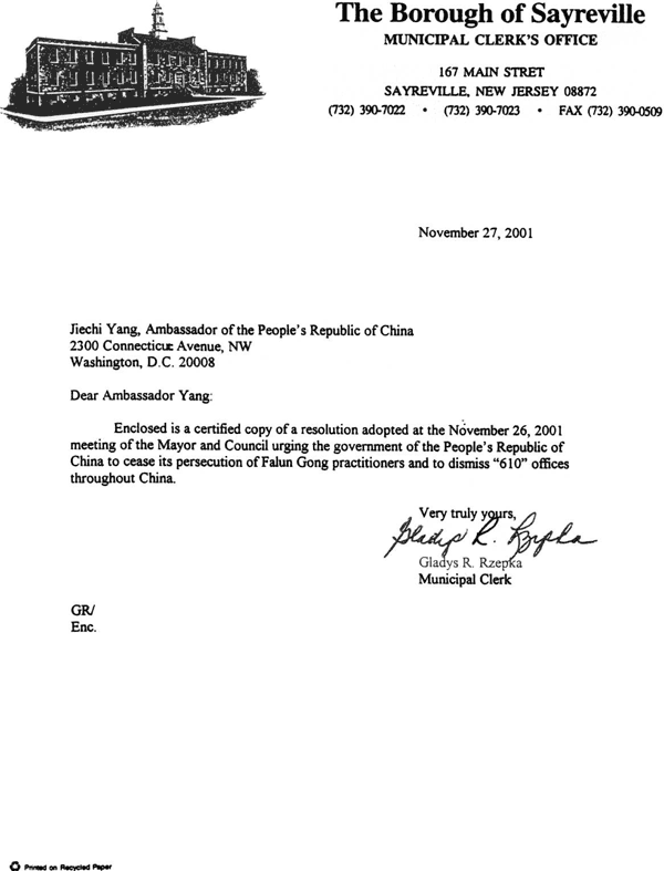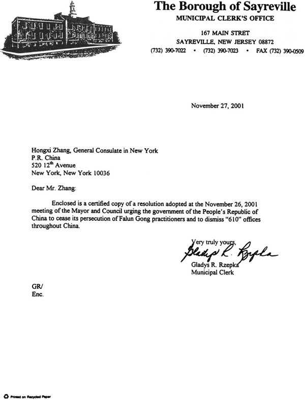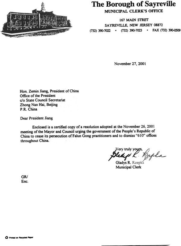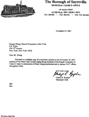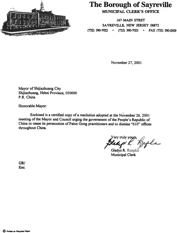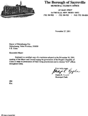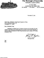 随信是一份2001年11月26日市长和市议会会议通过的决议的公正复印件,决议敦促中华人民共和国停止对法轮功修炼者的迫害并要求解散全中国范围内的“610”办公室。