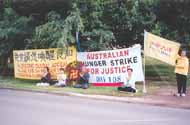 【明慧网2001年12月8日】近几个月以来,坎培拉中国大使馆前中国大陆游客络绎不绝,他们一走下旅游客车就会看到正对大使馆前的“法轮大法”和“修炼法轮功何罪之有”等大横幅。大法弟子的浩然正气令这些能幸运地在这特殊时期出国一游的中国人为之震撼。学员们除了派发真象材料外,还向他们播放真象广播,很多人因此消除了头脑中对大法的恶念,至少开始从新思考。不少人还用录相机将这壮观景象录照下来,也许他们能将大法的真相带回给国内的亲朋好友,使更多被谎言蒙蔽的生命清醒过来,从而被挽救。