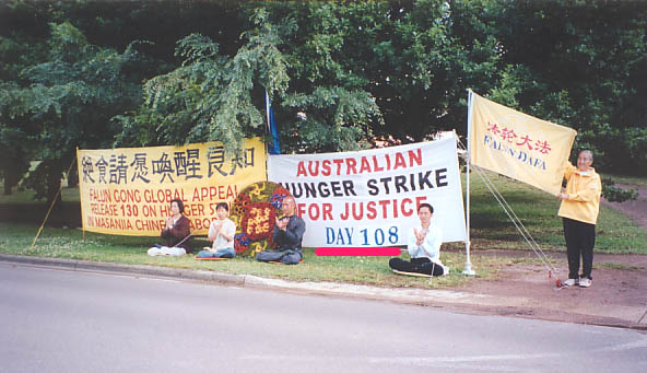 今天,12月7日,是澳洲大法弟子在坎培拉中国大使馆前接力绝食请愿第108天。在这108个日日夜夜 ,我们心中充满着对师父的敬仰,充满着对众生的慈悲。为了卫护大法的庄严神圣,为了救度被江泽民流氓政府蒙骗的可贵的中国人民,为了减轻中国大陆还在被邪恶的大法弟子的压力,我们会继续日夜坚守在堪培拉中国大使馆前,镇邪除恶,,直到法正人间这一刻的到来。