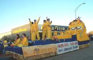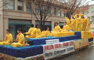 大家的心很齐,一到现场,就各自忙开了。有的整理散发的材料;有的挂牌子;有的装饰彩车;有的发正念,短时间内,一切就准备就绪。伴随著优美的“普渡”、“济世”音乐,彩车所经之处,天空绚丽,清亮无比。弟子们身著一色的黄色炼功服,面露微笑,带著慈悲祥和的心态,向人们展示着优美的五套功法。人们情不自禁地赞叹道:“太美了!”