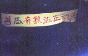 第二天,打听消息的同修传来了消息:镇里的人们都在议论十五日晚公路上的奇景,人们都在说,要说行,要说能,还得是人家“法轮功”。一夜间各大小路口横幅满天。