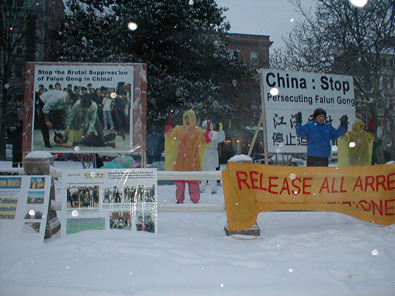 【明慧网2001年2月23日】华盛顿DC大法弟子在大风雪中来到中国大使馆前的天安门花园和平请愿,呼吁江泽民停止