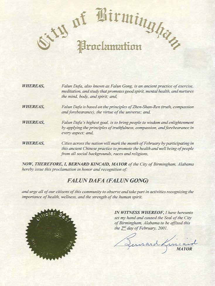 【明慧网2001年2月25日】 阿拉巴马州伯明翰市市长2001年2月2日发布“法轮大法”褒奖状
