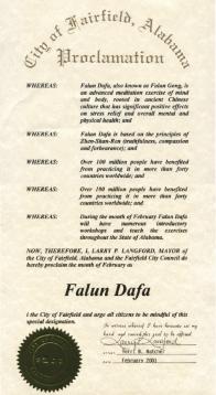 【明慧网2001年2月25日】 阿拉巴马州法尔菲尔德市宣布2001年2月为“法轮大法月”