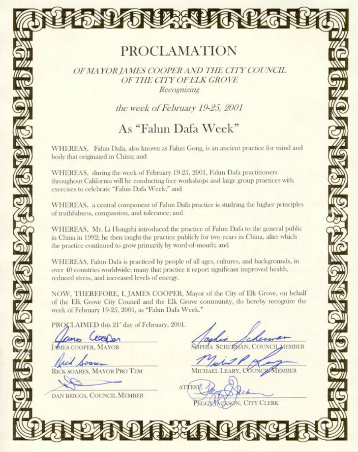 【明慧网2001年2月28日】 加州艾尔克格罗夫市(ELK GROVE)宣布2001年2月19日-25日为“法轮大法周”