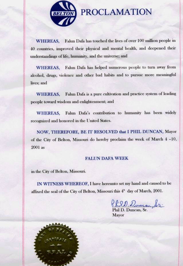 【明慧网2001年2月28日】 密苏里州贝尔敦市宣布2001年3月4-10日为“法轮大法周”