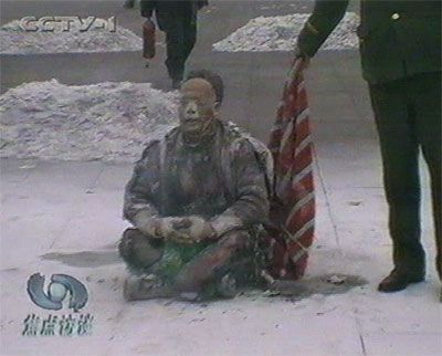 2.自焚王进东的齐刷刷的头发边缘及比例失调的面部让人感觉象带了假发或面具。由外观看其面部和衣着均未有多大焚毁,并且还能在镜头前声嘶力竭喊口号和有力地挥掉灭火毯,且能稳坐散盘、“结印”,这一切说明他并未严重烧伤,但报道中却说“4人大面积烧伤”、都做了“气管切开手术”、且经过“奋力抢救”“度过了休克期”,如何解释这种矛盾?答案可能只有一个:一切都是在演戏。