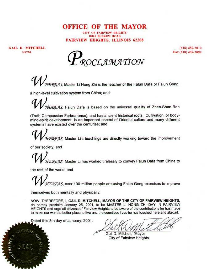 【明慧网2001年2月8日】 伊利诺伊州费尔优高地市(Fairview Heights)宣布二零零一年一月二十五日为该市“李洪志大师日”