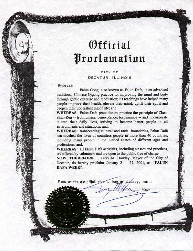 【明慧网2001年2月8日】 伊利诺伊州迪卡特市(Decatur)命名二零零一年一月二十一日至一月二十七日为“法轮大法周”。