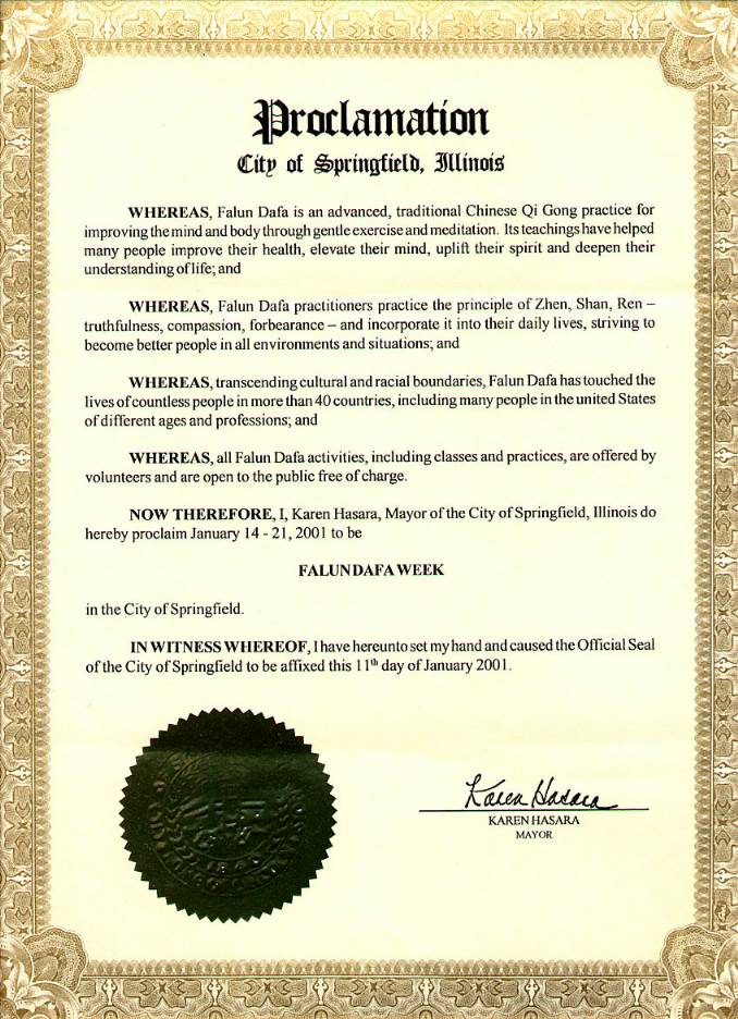 【明慧网2001年2月8日】 伊利诺伊州首府斯普林费尔得(Springfield)市命名二零零一年一月十四日至一月二十一日为“法轮大法周”