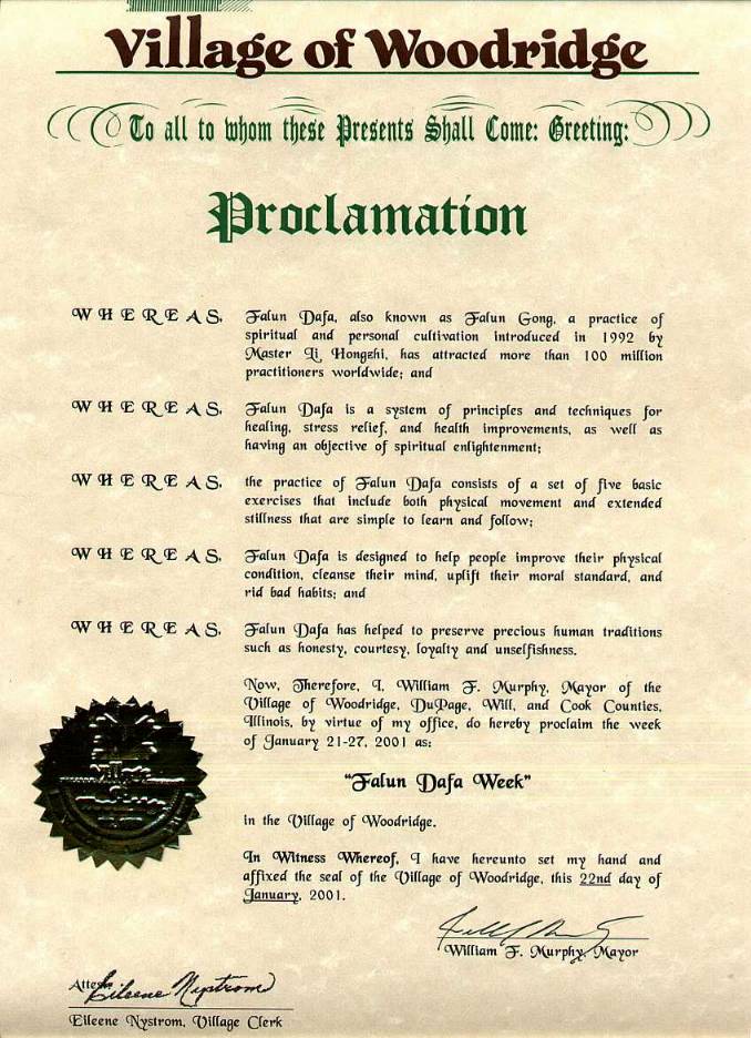 【明慧网2001年2月8日】 伊利诺伊州伍德瑞治(Woodridge)市宣布二零零一年一月二十一日至一月二十七日为“法轮大法周”