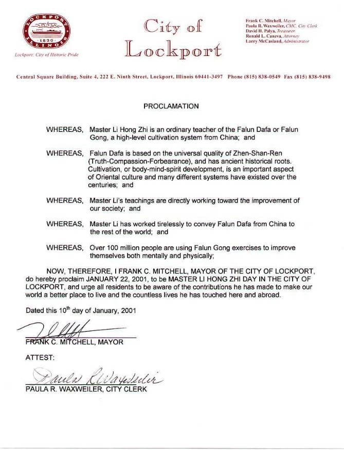 【明慧网2001年2月8日】 伊利诺伊州罗克泊特(Lockport)市命名二零零一年一月二十二日为“李洪志大师日”,并希望所有居民关注李洪志大师对改善社会做出的