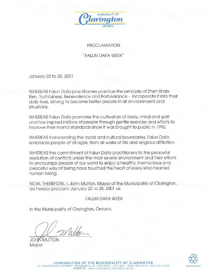 【明慧网2001年2月8日】 加拿大安大略省克拉瑞顿市宣布2001年1月22-28日为“法轮大法周”