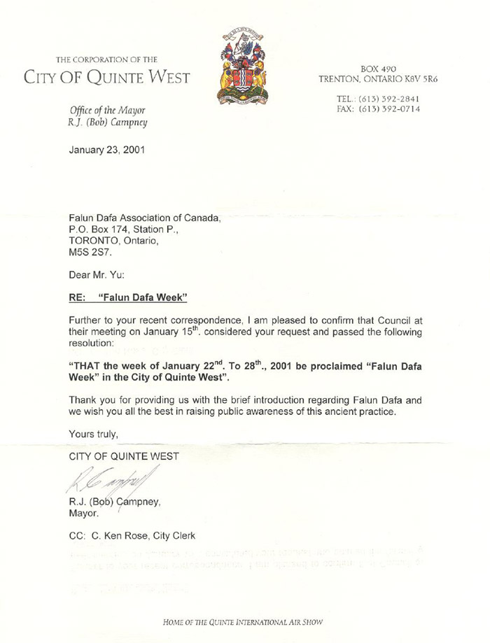 【明慧网2001年2月8日】 加拿大安大略省昆塔外斯特市宣布2001年1月22-28日为“法轮大法周”