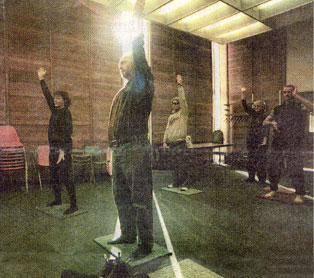 (左) 吉姆.哈格兰(Jim Haglund) 和他的妻子当娜(Donna),开始炼功。法轮功是具有中国传统的一种高层次功法,他能够使修炼者的身心得到提高。阳光明媚,照射在图书馆内,哈格兰夫妇带领一些人开始了炼功。