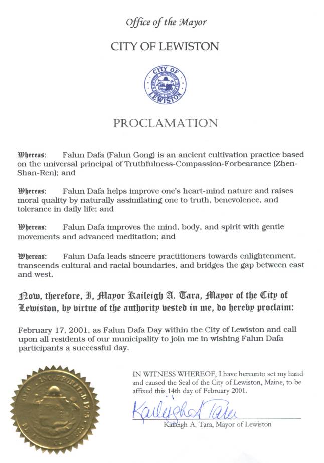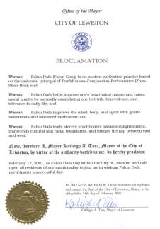 【明慧网2001年3月1日】 缅因州莱维斯顿市市长宣布2001年2月17日为“法轮大法日”