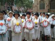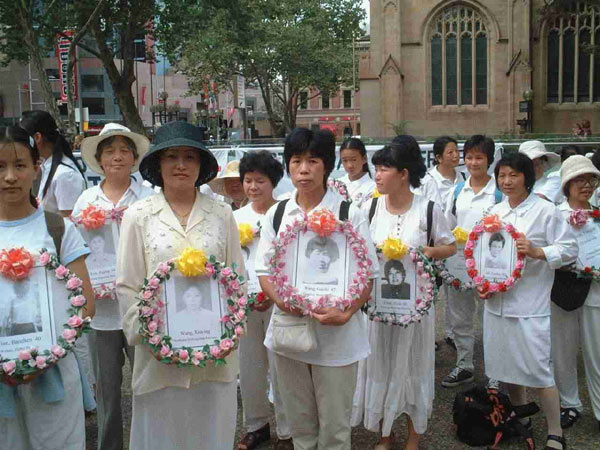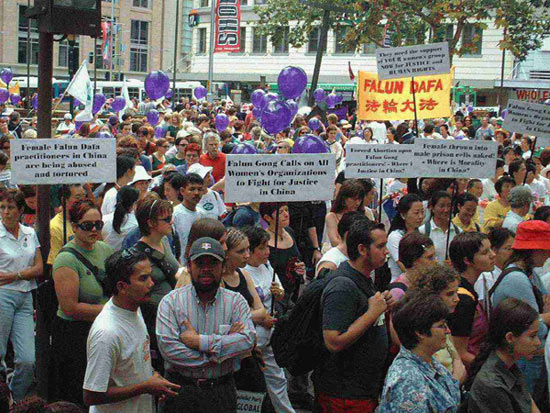 在约五十多个妇女各界团体组织组成的二千多人的浩浩荡荡的游行队伍里,可见悉尼法轮大法学员的队伍。由43名身穿素白装的女学员,手抱着43个花环,花环上安放着死着的照片及被江泽民犯罪集团迫害致死的女法轮功学员的名字,队伍的前面及花环队伍的后面可见大型黄底红字的“法轮大法”,“真、善、忍”横幅,由十个学员分别举着“T”形板上写着“中国停止迫害法轮功”,“维护所有妇女的人权和尊严”,“法轮功呼吁所有妇女组织为中国妇女争取人权和正义”,“女法轮功学员被扒光衣服投入男牢,中国道德何在?”等字样。队伍在悲壮的“普度”“济世”的音乐声中缓缓而行。两边的人行道上亦有学员在向行人散发真象材料、大法简介等。不少媒体、电台、电视台及路人则争相抢拍纪念镜头、录像等。两旁行人驻足观看,并鼓掌以示支持。