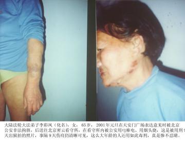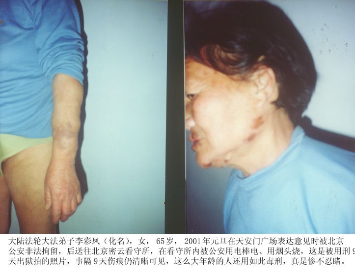 大陆法轮大法弟子李彩凤(化名),女,65岁。2001年元旦在天安门广场表达意见时被北京公安非法拘留,后送往北京密云看守所,在看守所内被公安用电棒电、用烟头烧,这是被用刑出狱9天后拍的照片,事隔9天伤痕仍清晰可见,这么大年龄的人还用如此毒刑,真是惨不忍睹。