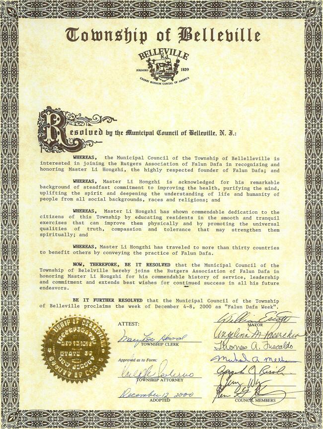 特做出如下决议:伯拉韦尔市市议会同罗格斯大学法轮大法学会一道表彰李洪志大师的广受赞誉的服务,领导,和献身的精神,并最衷心地祝愿他在未来的奋斗中取得更大的成就;
