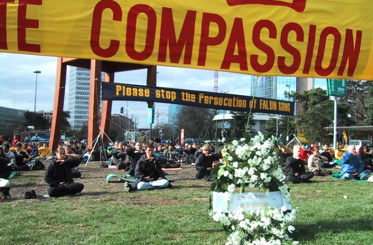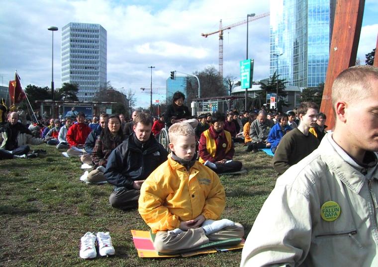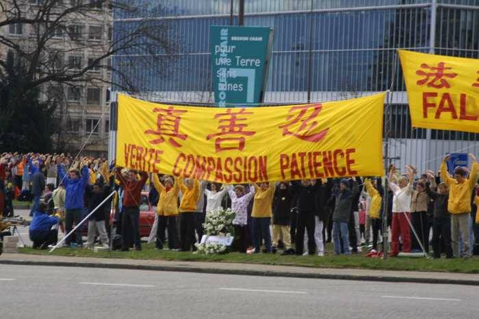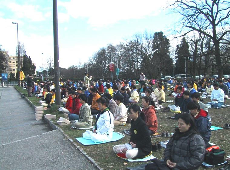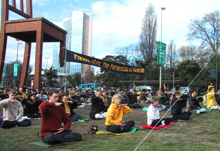 3月19日周一上午,来自欧洲及世界各地的一千多名法轮功学员在日内瓦联合国总部前的两个大草坪上炼功请愿,呼吁联合国及国际社会继续关注中国政府对大陆法轮功学员基本人权的严重侵犯,并帮助制止江泽民一夥的已持续近两年的对法轮功学员的犯罪行为。