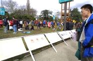 在草坪旁边,学员们放置了许多关于大陆学员遭受迫害的展板。学员们还打出了“法轮大法”,“真善忍”等横幅。一个蓝色的横幅上用英、法文写着,“请停止迫害法轮功”。
