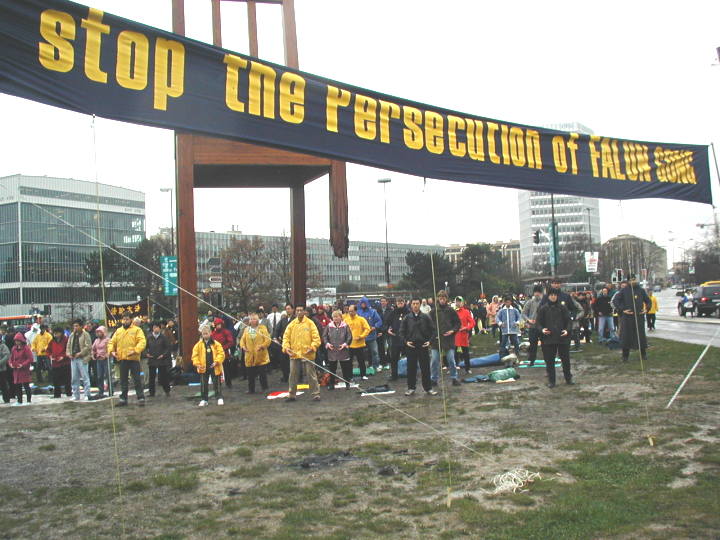 近千名来自世界各国的法轮功学员冒着细雨,坐在泥泞的草地上,不受干扰地静静打坐。从下午两点开始,学员们轮流地一遍一遍做着静功和动功,整个场祥和纯正,吸引着路过的行人和车辆不断回头注目。金色的“法轮大法”中英文横幅和蓝底黄色的英法文横幅“停止镇压法轮功”给整个场面加上了明亮肃穆的色彩。路边一字排开着以中文和法文介绍大法在世界洪传及在中国受镇压情况的图片,不时有行人驻足观看。