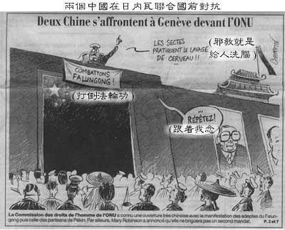 译注:在联合国人权委员会中国特色的开幕市上,有法轮功的追随者和北京的支持者去先后示威,另外又有玛丽.罗宾逊在联任之后辞职。