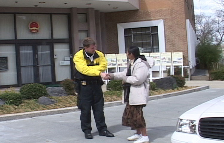 三月二十二日早上十一点,大法弟子安排把一封致钱其琛副总理的和平请愿书递进中国大使馆。当一切就绪,准备出发时,一位管区警察过来并很诚恳的告诉我们说:“请让我先进去探访一下,你们再进去,免得他们把你们抓住扣留,我完全没有办没帮助你们,因为进了他们的大门,就算是进了中国的领土,我是美国警察,看着也没法救你们。”于是我们就在街边等着,连采访的新闻媒体也只好耐心的等候。只见这位警察先生进进出出,一次比一次为难的告诉说“他们坚决不准你们进去。其实我也早已预期是这个结果,因为他们一向如此。我知道你们都是好人,我的朋友还特别关照说要善待大法弟子,因为你们是好人。”堂堂炎黄子孙被本国驻美使馆拒之门外,还得由美国警察介入并保护。中国成了什么样的国家?中国现在是个什么样的政府?中国实在已到了可怜亦可笑的地步了。