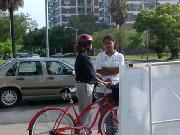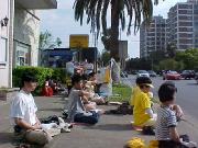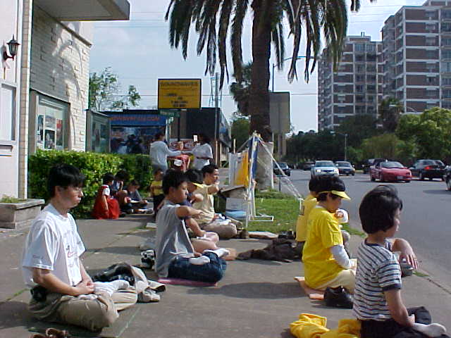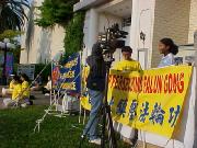 三月二十五日下午两点三十分,休士顿大法弟子来到中领馆前洪法,大型图片一一展开,摆放于中领馆前及路口,使路人一眼能见;这些图片有介绍大法,有些是法轮功学员被的照片及事例;中领馆的一位按照惯例的人士(也许是理事吧)出来了,一见到图片以及摆放朝向大街的横幅,写着中英文字"中国:停止镇压法轮功",他气极败坏,在这横幅前来回走了几次才进到中领馆内。时间不久,图片上被迫害的事例马上引起路人的关注,"法轮功,""怎么了?"路人们开始向弟子详细了解法轮功真相,而且还要求给他们资料带回去看。一位大学生见到弟子们炼功、及摆放的图片和横幅,马上一一拍照,并且询问了许多问题,其中一个问题是中国为什么打压法轮功?大法弟子给予了回答,她又问道:"你们在这儿炼功,中领馆有回应(response)吗?"弟子回答:"他们没有回应,但是中领馆外美国人士却有回应,因为他们在了解法轮功,有些还支持法轮功。正因为如此,我们每周必来,直到中国停止镇压为止。"一位弟子给了她"和平历程"小册子,她表示回去写有关这方面的文章。碰巧的是有一位电视台人士带着录像机正赶往某地采访,一见到大法弟子正在洪法的情景,马上抢拍了一些镜头,并且采访了一位弟子。他说:"几天前才报道了法轮功,没想到在这儿碰上了法轮功。"他得到了一些有关法轮功的资料。令人感人的是,一位美国中年妇女读完了图片上的所有事例,然后一直观看大法弟子炼功,她不断地赞叹着:"美极了,"她当即表示学炼法轮功。更多人通过了解法轮功后要求学炼法轮功的。