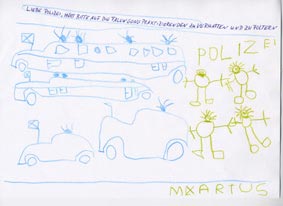 这次他与妈妈和哥哥一起去日内瓦呼吁中国停止对法轮功的镇压。中国警察的做法让他不可思议,在泥泞的万国广场炼完功,他画了这幅画,并请求他母亲写上:“尊敬的警察,请停止对法轮功学员的捉捕及打压。”并希望能将此画交给大陆的警察。
