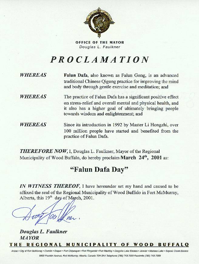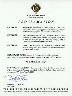 【明慧网2001年3月29日】 加拿大阿尔伯塔省麦克马瑞堡市宣布2001年3月24日为“法轮大法日”