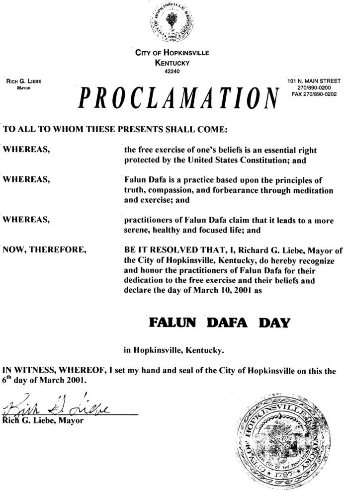 【明慧网2001年3月31日】 肯塔基州霍普金斯维尔市宣布2001年3月10日为“法轮大法日”