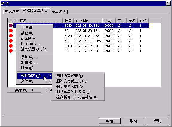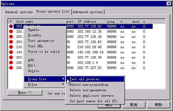 (1) 到MP作者的主页寻找。在MP中选择“update proxy list”(更新代理列表)项后,就会自动链接到MP的主页。MP的作者已将代理服务器列表分为匿名和非匿名两类,读者可选择下载并存成TXT文件。我建议下载匿名的(anonymous),但经测试这些代理服务器对大陆学员可能不是非常适用。(大部分很难连上)