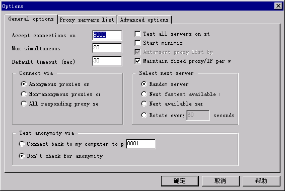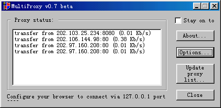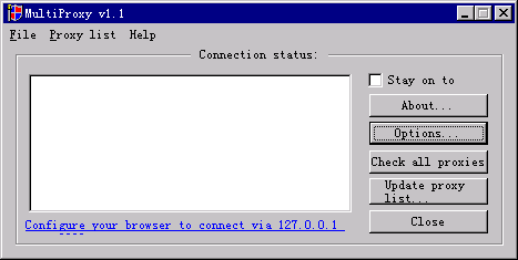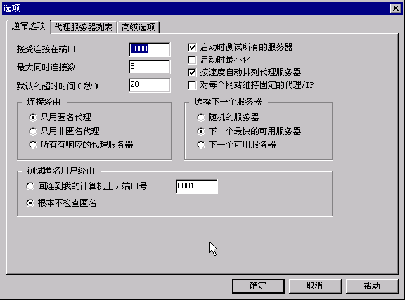 1) Multiproxy的特点就是能够使用户同时使用多个代理服务器,达到万马齐驱的目的。理想状态是越多的代理服务器同时工作,速度就越快。但是实际并不是如此。Multiproxy默认最多同时连接的代理服务器是8个,这个数字一般比较科学。虽然用户可以改变最大同时连接数,但我建议还是不改的好。这样我们就可以发现我们只需要少量的代理服务器地址就行了,而不是输入成千上百的地址就能达到更高的速度。相反越多的代理服务器地址在启动Multiproxy时,验证时间也就越长,通常是不可取的。一般列表中有10-15个匿名的国外代理服务器比较好。
