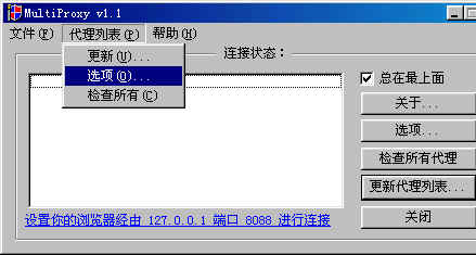 在介绍MultiProxy之前,首先简单介绍一下代理服务器的原理及作用。与直接连接到Internet相比,使用代理服务器有三个主要的优点:一是能突破网络封锁,让用户可以毫无阻碍地真正畅游Internet的任一角落,二是能保护上网用户的IP地址,从而保障上网安全;三是能显著提高网络浏览速度。但是这些优势只能在一种理想化的条件下才能实现,为什么这么说呢?我们都知道,代理服务器的原理是在客户机(用户上网的计算机)和远程服务器(如用户想访问远端WWW服务器)之间架设一个“中转站”,当客户机向远程服务器提出服务要求后,代理服务器首先截取用户的请求,然后代理服务器将服务请求转交远程服务器,从而实现客户机和远程服务器之间的联系。很显然,使用代理服务器后远端服务器包括其它用户只能探测到代理服务器的IP地址而不是用户的IP地址,这就实现了隐藏用户IP地址的目的,保障了用户上网安全。但这样的结果必须有一个理想的前提,即代理服务器必须是可靠的。因为虽然远端服务器探测不到用户的IP地址,但从代理服务器上能很容易地得到用户的真正IP地址,尤其如果代理服务器是中国大陆某些部门下属的202.97.XX.XX的假代理的话,后果将不堪设想。其次使用代理服务器可以加快用户的浏览速度的原因是因为如果很多用户使用的是同一个代理服务器的话,这些用户访问过的内容都会存储在代理服务器的缓冲区中(一般代理服务器的缓冲区会相当的大),其后当有人再浏览这些内容时,这些内容可以直接从代理服务器的缓冲区中获取而不必花费更多的时间去连接远程服务器,这就无疑提高了用户的访问速度。但事实是一般情况下代理服务器的反应速度并不比直接连接远程服务器的速度要快,特别是当使用国外的代理服务器连国内的WWW服务器时(一般用国外的代理服务器连国外站点速度确实有所提高,而且不会出现“该页无法显示”的提示)。