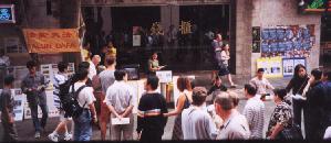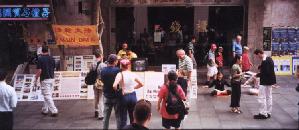 在三十五天的洪法活动中,学员们在繁华的唐人街闹市处展出真相图片,有时还播放真相录相,这些触目惊心的真实展现,使许多路人在过往此处时停下脚步观看,血淋淋的图片、镜头中的暴行记实,使人一目了然,真相的曝光,唤起了世人的善念,有正义感、有同情的世人忍不住摇头、叹息,伸出那援助之手主动在征集名册上签名,有的还在空白处写道:With Sorrow(悲伤地);有的拿起签名册说:“中国的人权状况糟透了,……。”有一位爱尔兰女士看了图片介绍後流着眼泪说:“我要签名,希望这些签名能帮助中国的法轮功修炼者改善人权状况。”