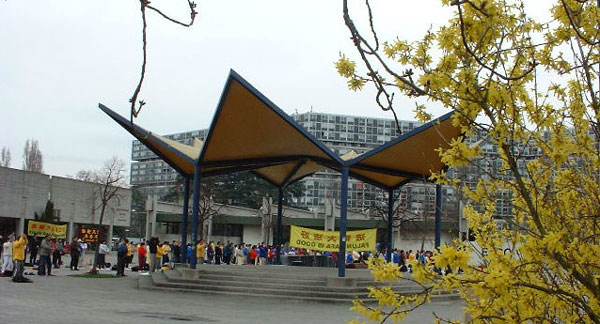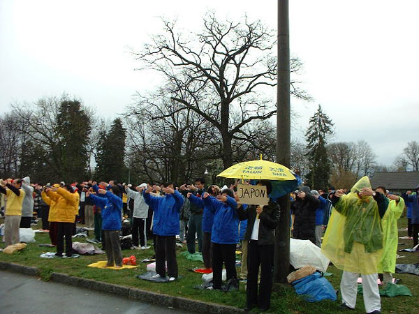 三十多位来自日本的法轮功学员参加了3月18日的交流会,收获甚大。在其后的今年联合国人权委员会会议期间,日本学员与来自欧洲、美洲、亚洲、非洲、澳洲等世界各地的学员一起,连续3天,白天半天在日内瓦万国广场炼功,半天在集中住宅区的Cite Lignon公园炼功,晚上与各地区学员一起交流。第2、第3天炼功均是雨天,万国广场的草地一片泥泞,雨声、往来汽车声中,法轮功学员专注于法轮功的炼功音乐,一遍一遍地演炼五套功法,站立或打坐在雨水泥泞中,千人整齐排列,肃穆炼功,有的未着雨衣,已是浑身淋湿,泥水满身。身临其境,一片祥和悲壮。