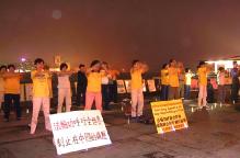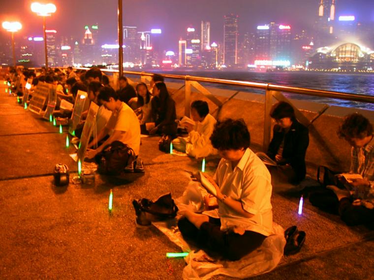烛光晚会分别在香港岛中区大会堂外,及九龙尖沙嘴海滨公园举行,隔海呼应。学员们神色庄严肃穆,或默坐或学法或炼功。前排揭露邪恶的宣传板以及弟子们祥和平静的气氛,吸引了来往过路的中外行人,他们有的驻足观望,有的过来询问。看得出他们中有许多人已对法轮功有了一定的了解,甚至一看到我们就主动向自己身边的朋友解说着什么。学员们也上前解说并派发真象资料。师父的慈悲笼罩着大地,看着那些有缘正面了解大法的人们,他们的善念已选定了他们的未来。