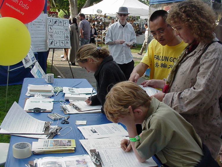 【明慧网2001年4月19日】 今年加州帕莎迪那春季艺术节于4月14、15日在帕莎迪那市老城区的中央公园举行。时值日内瓦联合国人权会议举行之际,南加州附近的法轮功学员们决定利用这个机会,向世人征集签名,讲清真相,同时向有缘人洪法。