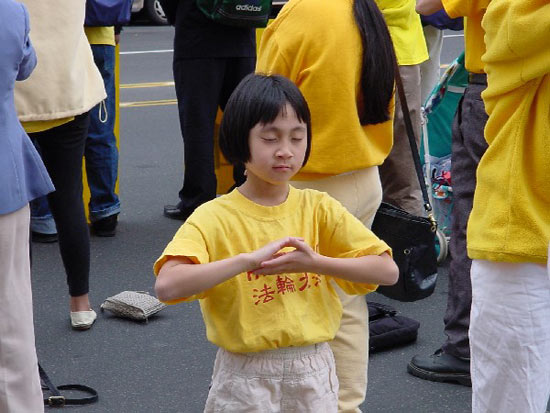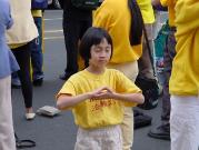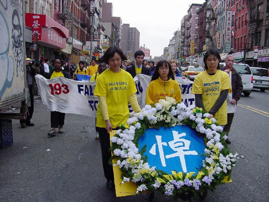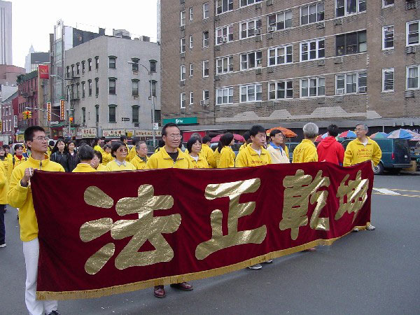 下午一点,法轮功学员排列成了整齐的游行队伍,从孙逸仙中学出发。游行队伍以绣着“法正乾坤”四个金色大字的横幅打头,然后是写着“真善忍”的金字蓝底横幅,中间是一个悼念被折磨致死学员的花圈,队伍的后面是要求江泽民政府停止镇压法轮功的标语。游行队伍随着“普度”的音乐声缓缓地向中国城的闹市区前进,庄严而又平和。