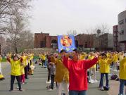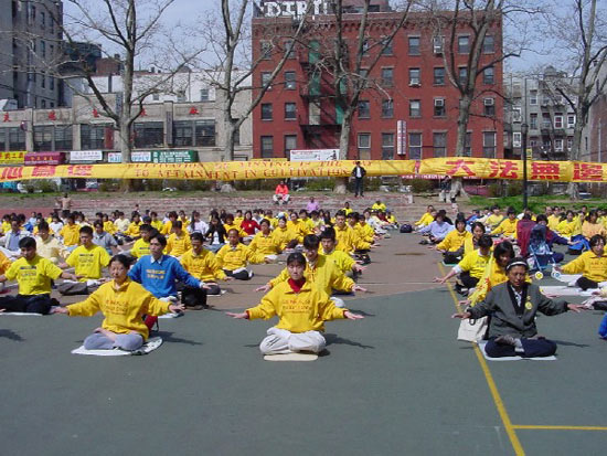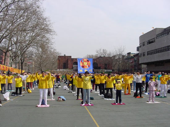 4月21日是纽约法会的第一天,五百多名来自大纽约地区,美国其它州,以及海外的法轮功学员,在纽约中国城的孙逸仙中学的操场上进行了集体炼功。