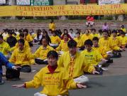 早上10点,五百多名法轮功学员已整齐地站满了整个操场,操场的北端悬挂着一面五米多高的法轮旗,法轮图形下三个金色的大字“真善忍”在阳光下闪闪发光。4月的纽约风和日暖。在明媚的阳光照耀下,身着黄色衣服的法轮功学员伴随着优美的炼功音乐缓缓地炼起了五套功法。学员们优美的动作,随着音乐慢慢的上下起伏会成了一片金色的海洋,在大法轮的衬托下显得既壮观又祥和。