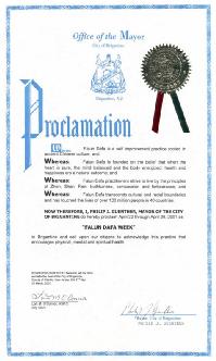 【明慧网2001年4月23日】 新泽西州布芮甘亭市宣布2001年4月22 - 28日为“法轮大法周”。