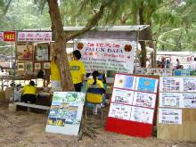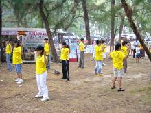 4月21、22日塞班岛弟子租了一个大展位,挂上大型的法轮大法宣传广告,金光闪闪的法轮格外抢眼。弟子们穿上黄T恤在草地上反复集体炼功,吸引了很多游人驻足观看,有些弟子在散发各种真象材料,同时向人们征集签名。表面上好像是我们求得世人的同情帮助,实际上是在正法过程中尽量地挽救未来的人,能救一个就一个。在两天时间共征集了一百多个签名,散发近千张传单。