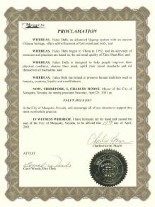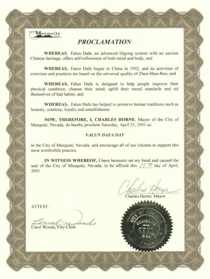 【明慧网2001年4月25日】 内华达州墨斯基市宣布2001年4月21日为“法轮大法日”