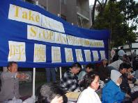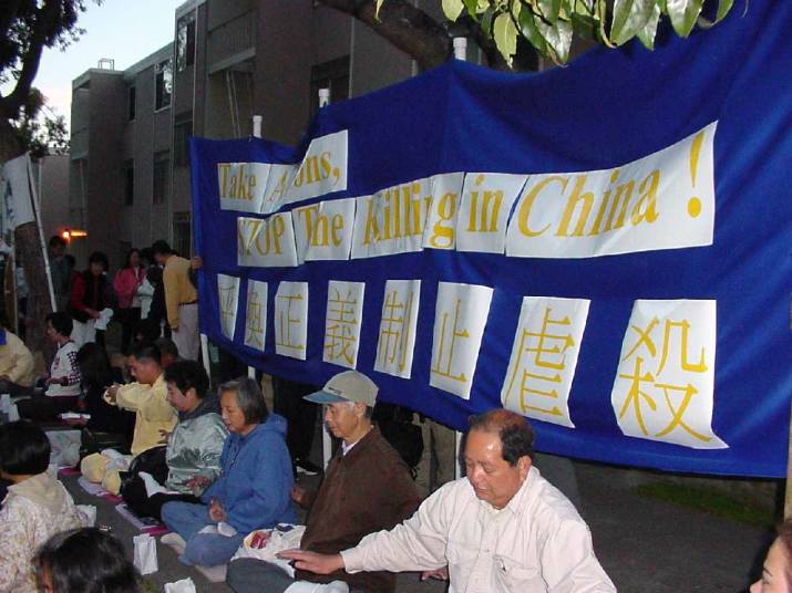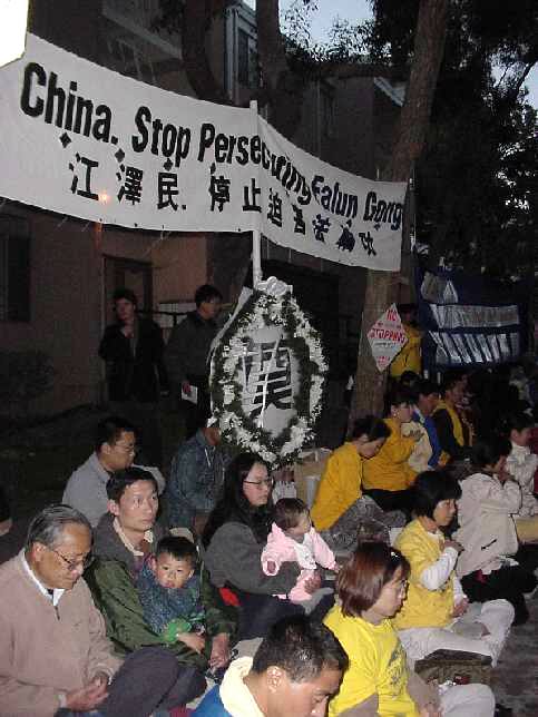 【明慧网2001年4月25日】 当地时间四月十七日晚,在联合国人权委员会决定是否讨论中国人权问题投票前夜,北加州一百三十多位法轮功学员和支持者加入世界各地学员和支持者的全球烛光守夜活动,在中国驻旧金山领事馆前举行长约三个小时的请愿,在烛光中悼念被江泽民迫害致死的一百九十多位学员,呼吁联合国和社会各界“行动起来,制止在中国的虐杀”。当地中文电视台和报纸记者做了现场采访和报导。