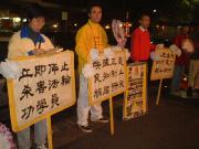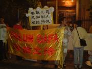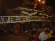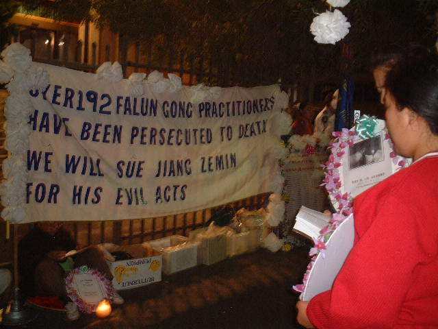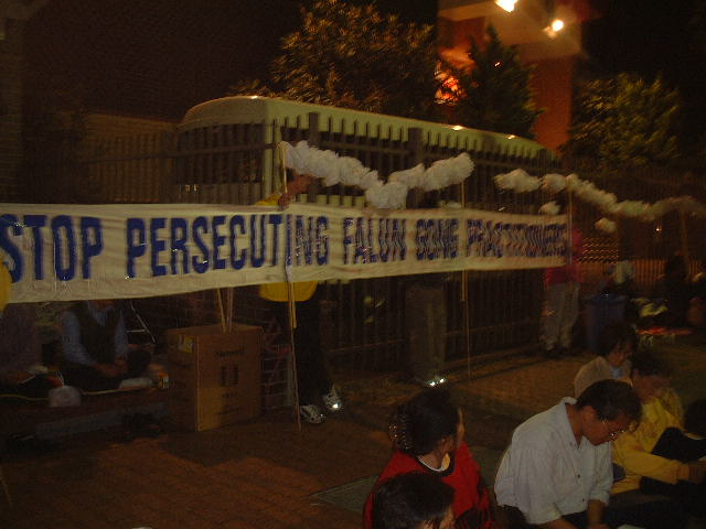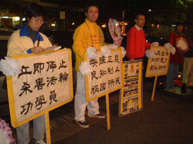 沿路边,弟子们拉起了巨型横幅“为什麽和平的法轮功修炼者要遭受迫害?”、“193名大法弟子被迫害致死,江泽民的邪恶行径将被起诉”、“请给法轮功修炼者自由以支持”,在坐着的弟子中,弟子们用手举 着的标语板上写着“立即停止杀害法轮功学员”、“唤醒良知,制止祸国殃民”。在横幅後面一排的正中间是“法轮大法”和“真、善、忍”两面迎风招展的彩旗。在横幅的正中央,安放着的一个巨型花环上写着193位被迫害致死的大法弟子的名字。白色的花朵被系在铁栅栏上和挂在横幅的两边。大法弟子手抱着写有死亡弟子名字的花环,静坐在横幅的两旁,前面放着一盏盏烛光灯,《普渡》、《济世》的大法音乐此时此刻显得更加悲壮、悦耳。场面肃穆庄严,吸引了所有路过的车辆上的人们及路人观看。有几个大法弟子在向汽车上的人们及行人发放大法简介及真相材料,绝大部分的人们都欣然接受或主动索取。有的以鸣笛和伸出大拇指,并叠连声称“Good! Good!……”表示赞同和支持,有二个西人先後主动对弟子说,“看了4月22日(星期日)ABC电视台播放的40分钟法轮功专题采访节目,觉得很好,太好啦。法轮大法,我支持你。”表达了他们对中国人权状况的极大关注。也有停下车来向弟子询问“今晚发生了什麽事?”努力了解情况的……。过路汽车秩序井然地开过,车里坐着的人在路过的瞬间也被这里强大的慈悲、祥和的场所溶化,过路的人们在心里都要念一句“法轮大法”。
