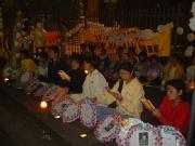 烛光、大法音乐、花环、白花、彩旗、横幅、标语板、汽车开过的唰唰之声,夜空闪烁的星点……,汇织了一幅动人的夜景。当晚,有20多个弟子坚持通宵守候在现场,渡过了这个不寻常的夜晚。