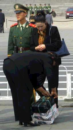 3.美联社4月25日星期三图片报导,2001年4月25日,一个武警在北京天安门广场等待搜查一个中国妇女的包袱 。警察于周三--法轮功中南海请愿两周年纪念日,在广场拘留了至少20人。美联社/Ng Han Guan)