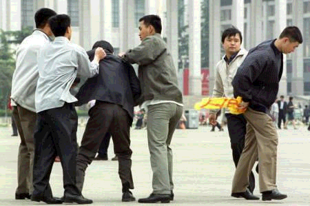 4.路透社4月25日星期三图片报导,法轮功成员在中南海请愿两周年纪念日被拘留--中国便衣警察4月25日在天安门广场拘留了一名法轮功抗议者,并没收了他的横幅。路透社/Chien-Min Chung